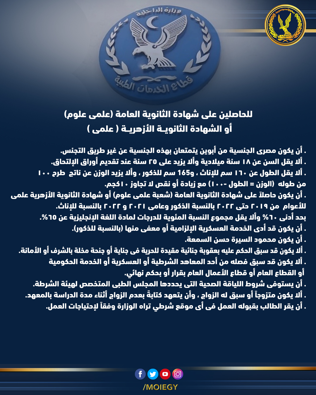 وفى هذا السياق أعلنت وزارة الداخلية فتح باب التقدم للإلتحاق بالمعاهد الفنية الصحية الشرطية للحاصلين على شهادة الثانوية العامة )علمى علوم( والشهادة الثانوية الأزهرية )علمى( للأعوام من ٢٠١٩ حتى ٢٠٢٢ للذكور وعامى ٢٠٢١ و٢٠٢٢ للإناث ) بحد أدنى ٦٠% على ألا يقل نسبة النجاح فى اللغة الإنجليزية عن ٦٠% .