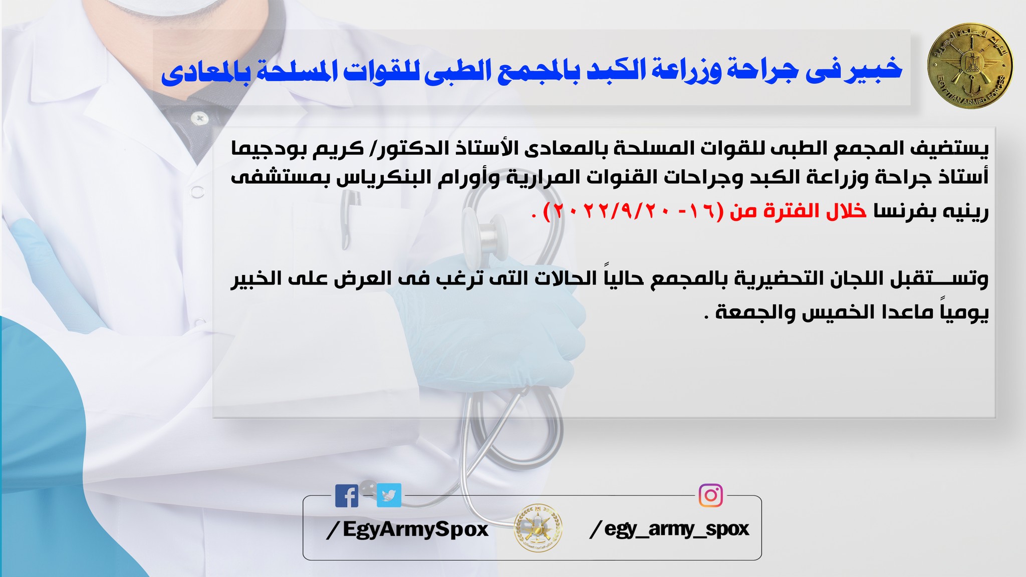 يستضيف المجمع الطبي للقوات المسلحة بالمعادي الأستاذ الدكتور "كريم بودجيما" أستاذ جراجة وزراعة الكبد وجراحة القنوات المرارية وأورام البنكرياس بمستشفي رينيه بفرنسا وذلك خلال الفترة من 16 إلي 20 من شهر سبتمبر الجاري .